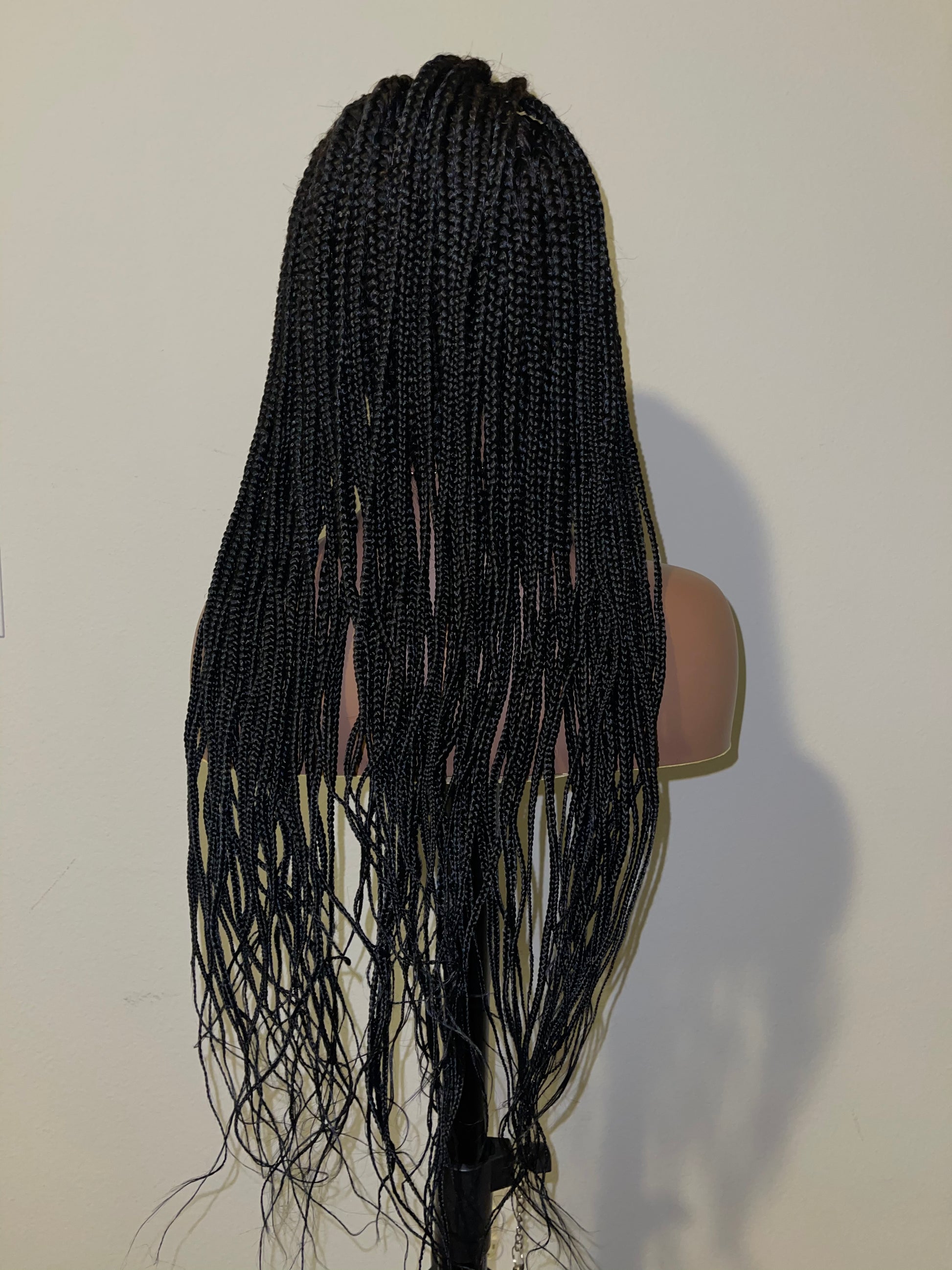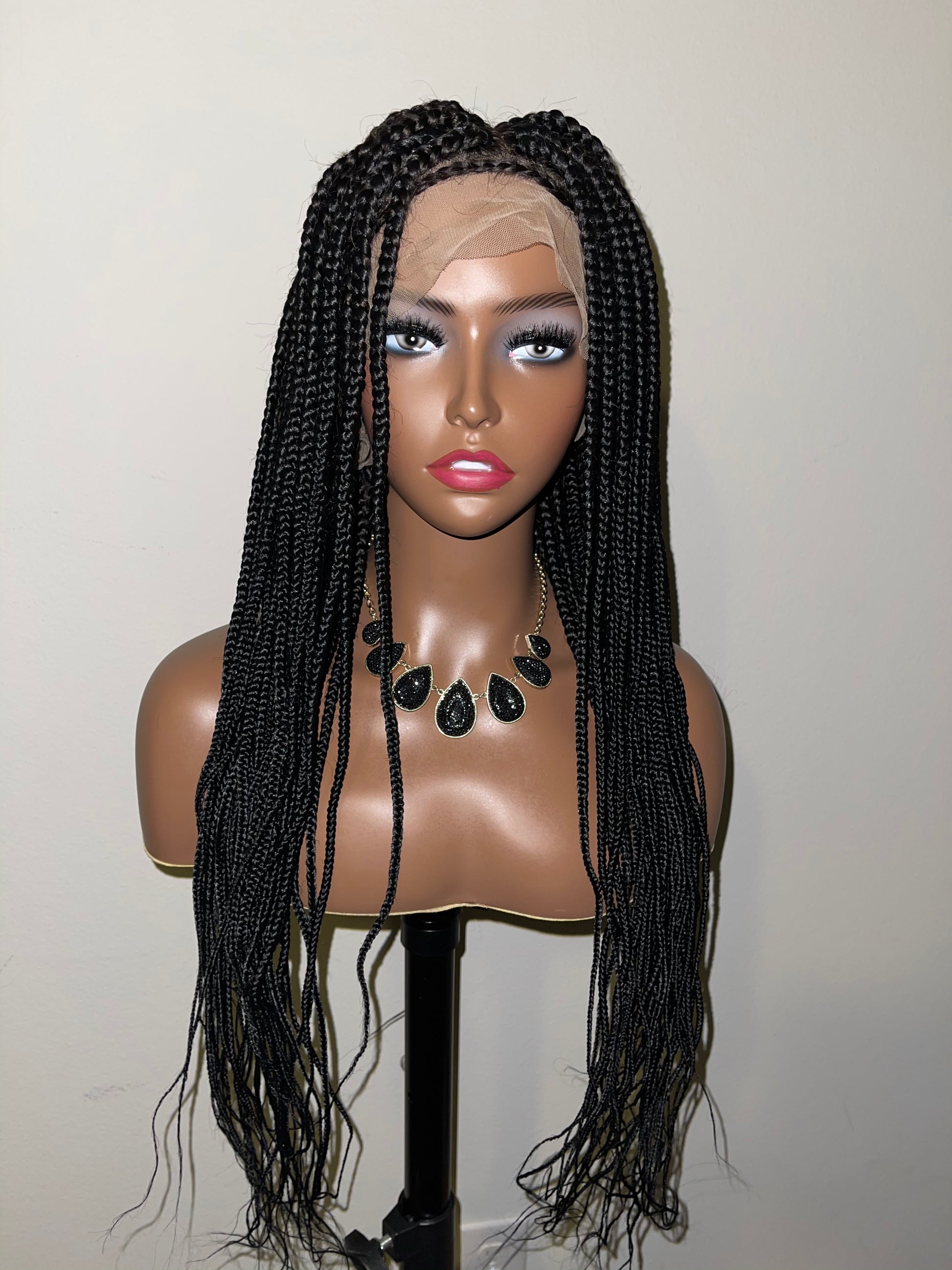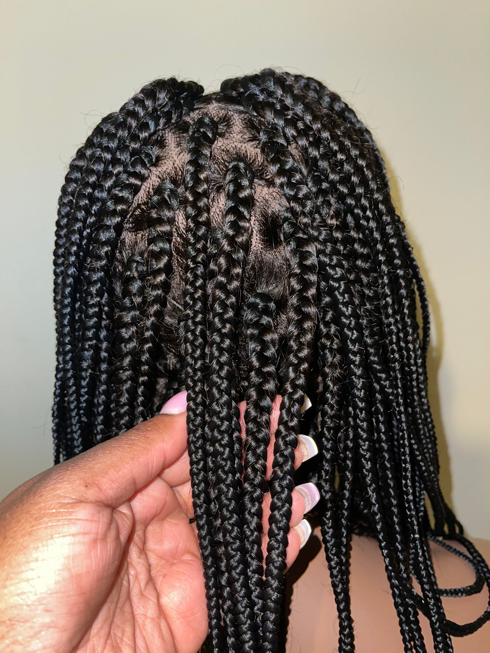 This wig is a full lace Box Braid Wig is 22 inches in length. Medium size braids. There are 2 combs on the side and 1 in the back. It comes in the color Black. The hair used is 100% Kanekelon Hair. This base of the hair is Virgin hair including baby hairs.