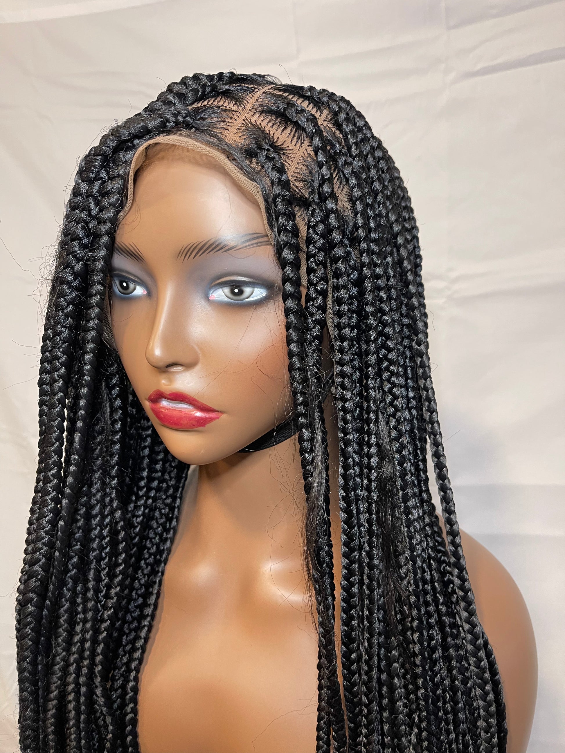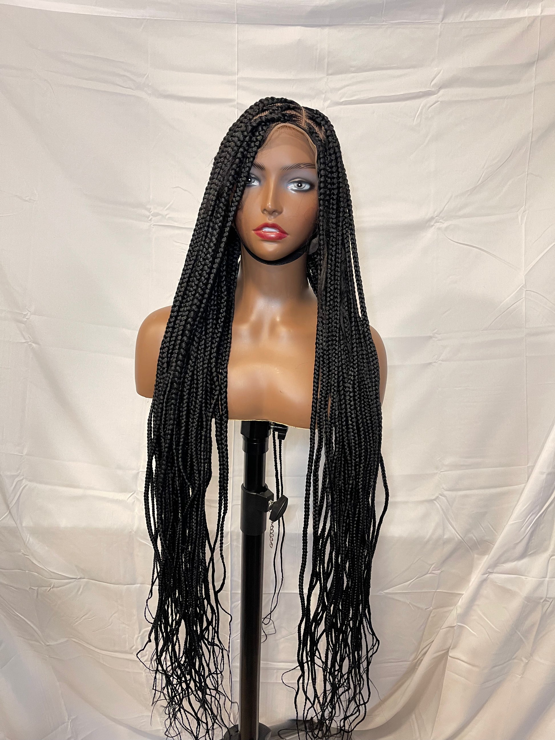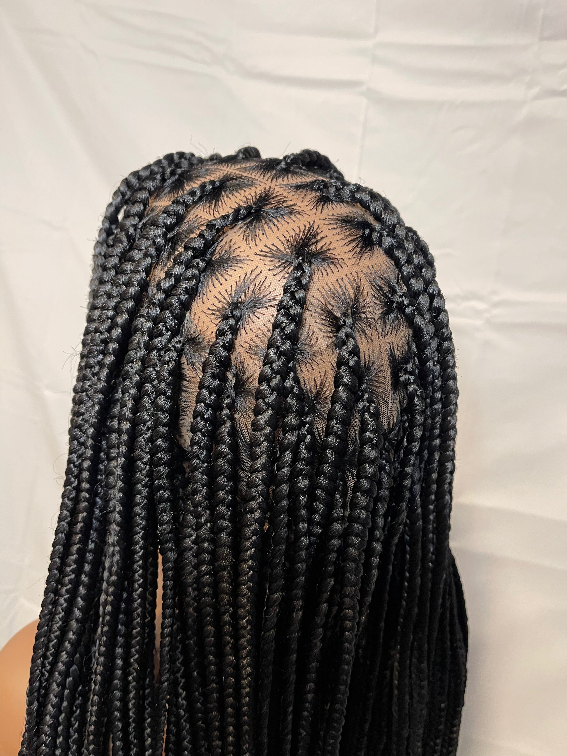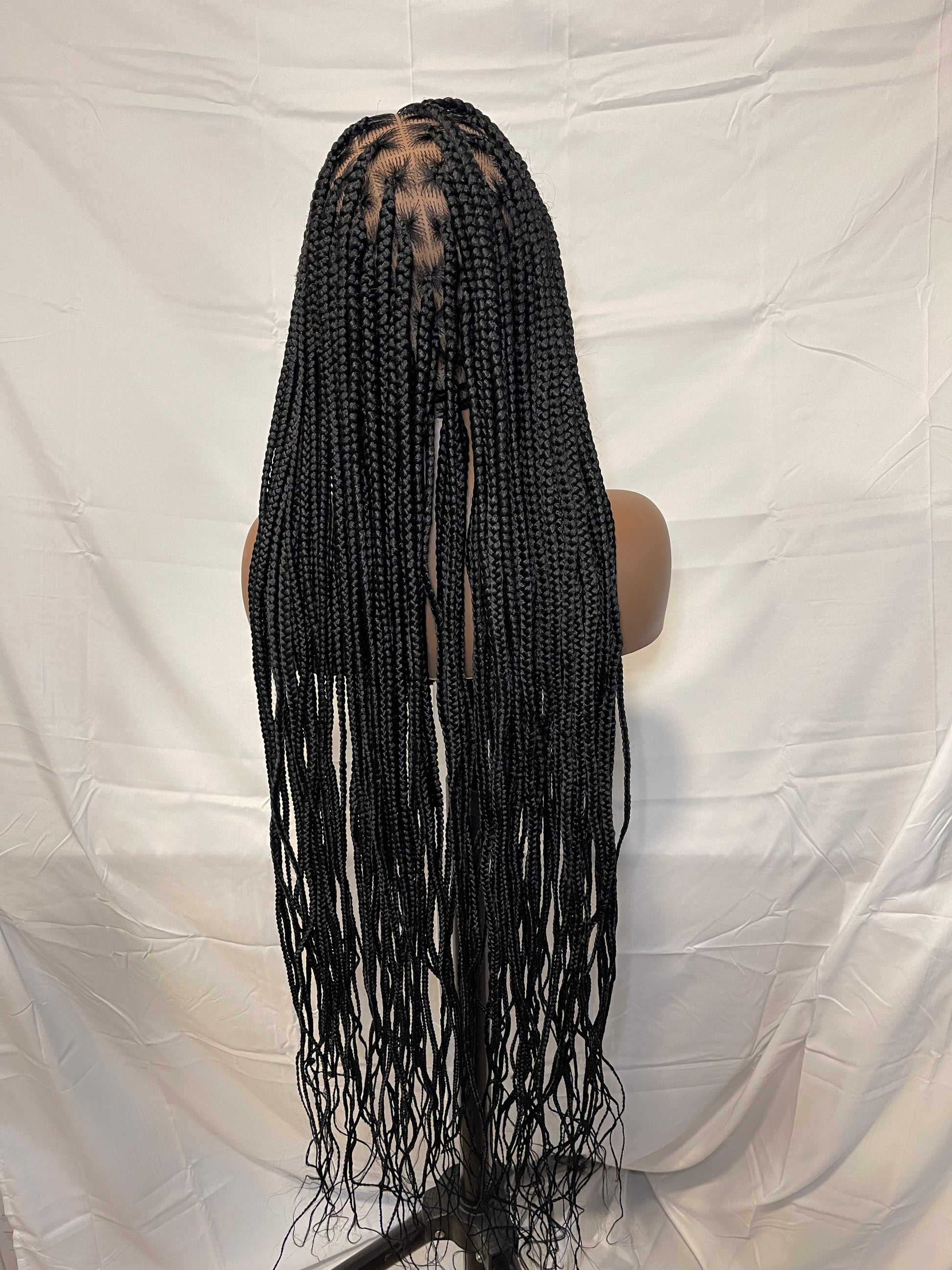 35 inches in length from the last row of braids. Knee length on a person who is 5’3” tall